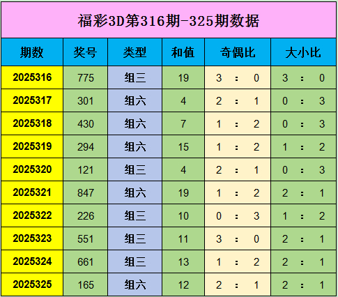 福彩3D上期开出奖号为165,奖号为组六形态,和值为12,奇偶比为2 : 1,大小比为2 : 1。